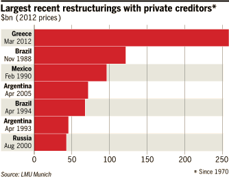 La Grecia ha imposto la ristrutturazione ai possessori di titoli nazionali anni dopo l’inizio della crisi, mentre i creditori nazionali sono stati completamente ripagati, hedge fund compresi. Tuttavia, la preoccupazione riguardo all’integrità del sistema vigente è stata portata all’esasperazione dalle sconfitte legali dell’Argentina, per mano degli hedge fund e in relazione alla ristrutturazione del 2001.