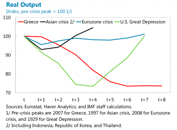 Grazie ad un grafico che mette a paragone il crollo dell’economia greca e la crescita in contesti diversi, come quella registrata con la reflazione del ’33 negli Stati Uniti, il Fondo Monetario Internazionale divulga implicitamente il perché la Grecia avrebbe dovuto dire addio all’Euro anni fa.