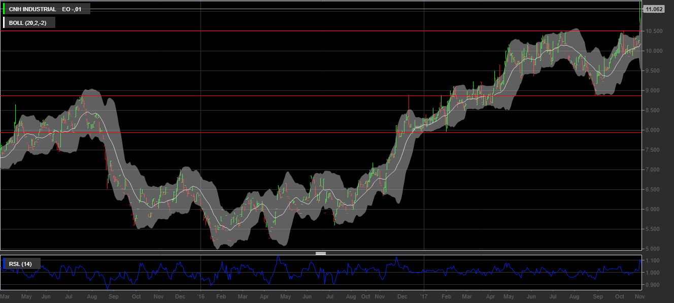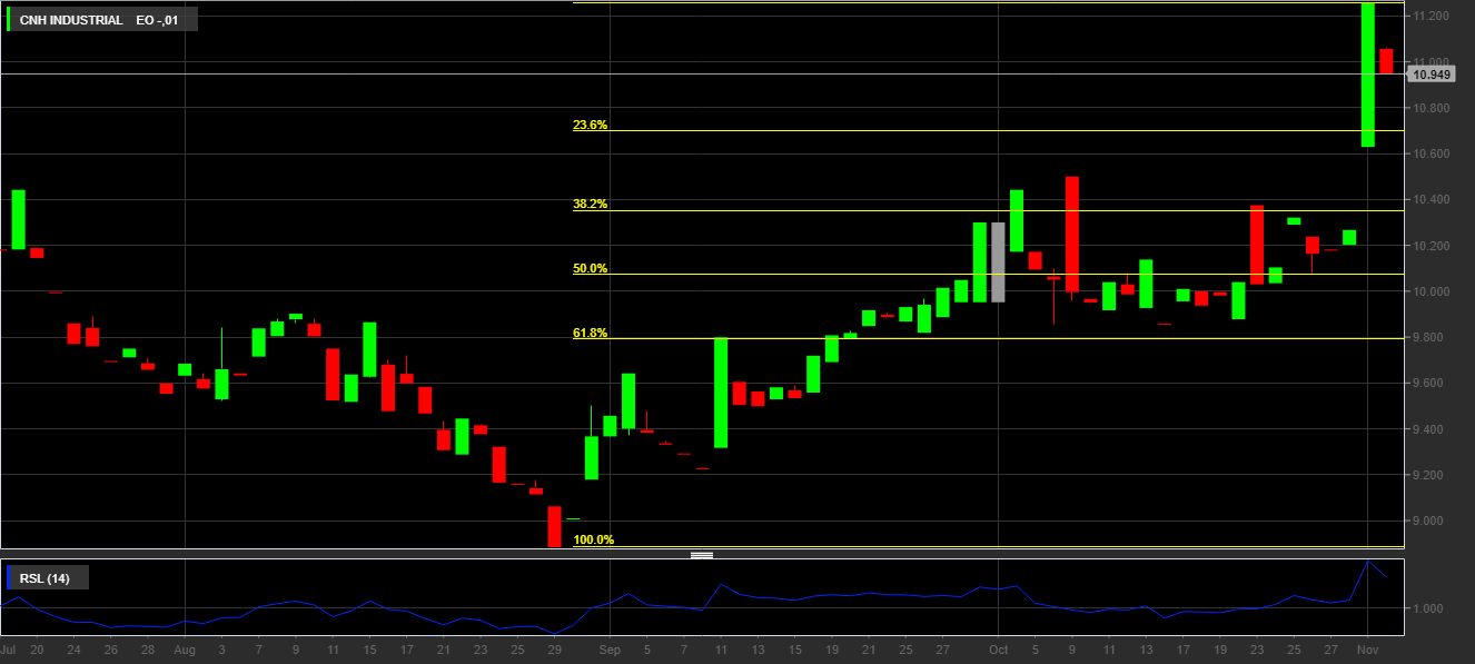 A trainare l’indice mercoledì 1 novembre è stato certamente il titolo di Cnh Industrial, che ha ottenuto nella giornata di ieri 1 novembre il 6%, andando a registrare un nuovo record storico segnando 11,26€.