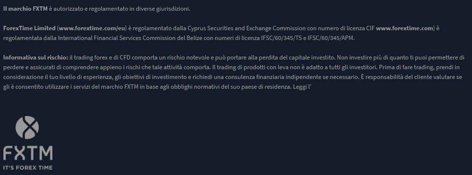- FXTM è regolamentato in molteplici giurisdizioni (ForexTime Ltd dalla CySEC 185/12, FT Global presso la IFSC con i numeri IFSC / 60/345 / TS e IFSC / 60/345 / APM);