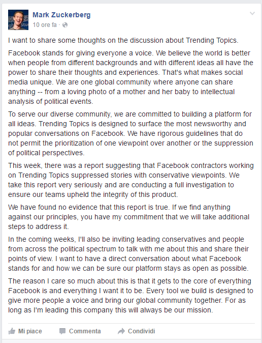 Il fondatore e CEO di Facebook ha rilasciato una dichiarazione in risposta alle accuse rivolte ai suoi dipendenti, i quali applicherebbero intenzionalmente la censura ai contenuti che esprimono un punto di vista conservatore non facendoli apparire nella sezione Trending Topics del sito.