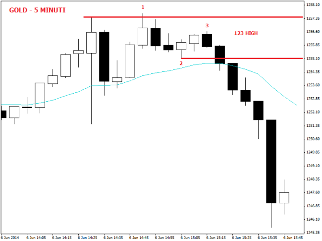 Il grafico a 5 minuti dell’oro evidenzia prima un falso breakout della micro-resistenza di area 1.257$ e poi un 123 high, che si completa quando i prezzi perforano il micro-supporto di breve termine di 1.255$, corrispondente al punto numero due del pattern di Ross. Da notare poi anche la formazione di candele reversal ogni volta che i prezzi vanno a contatto con la resistenza di 1.257$, ma anche al punto numero tre del pattern 123 high di Ross. Dopo il breakout ribassista del punto due, i prezzi crollano offrendo una buona opportunità di guadagno.