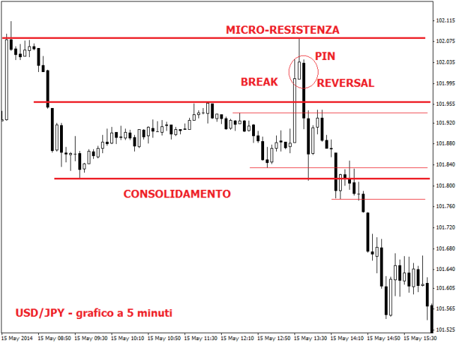 Il grafico a 5 minuti in alto del cambio dollaro/yen mostra un falso breakout di un consolidamento intraday, che inizialmente mette in evidenza un movimento bullish a seguito della rottura della parte alta del trading range. L’accelerazione dei prezzi ha però vita breve: il contatto con una micro-resistenza provoca un contro-movimento molto brusco, ben visibile con la formazione di una pin seguita da una candela reversal. Da questo momento inizia un bearish trend piuttosto robusto, che proseguirà nelle ore successive offrendo una buona opportunità short in ottica di scalping.