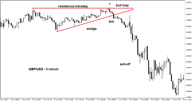 Nel grafico in alto sul tasso di cambio Sterlina/Dollaro (GBP/USD), time frame a 5 minuti, si può notare il falso breakout (bull trap) di una resistenza chiave del mercato intraday. I prezzi iniziano la loro inesorabile discesa, che sperimenta una robusta accelerazione bearish nel momento in cui avviene la rottura ribassista del wedge. Nel giro di poche ore il “Cable” perderà circa 70 pip.