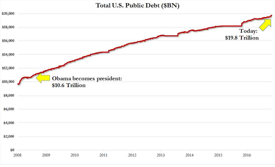 Con il deficit in rapida crescita e il rapporto debito/PIL arrivato a livelli che non si vedevano dall’ultimo dopoguerra, il debito americano durante l’amministrazione Obama non ha fatto altro che crescere, come osservabile dal seguente grafico: