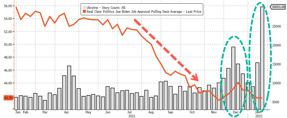 Comparazione fra rating di gradimento di Joe Biden e presenza dell’Ucraina nelle news