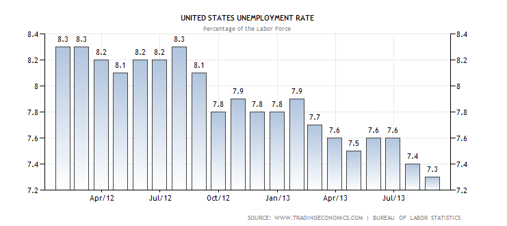 Da quando la Federal Reserve ha avviato il terzo round di stimoli monetari, il tasso di disoccupazione è sceso dal 8.1% al 7.3%. Tuttavia, buona parte di questo calo è dovuta dal ritirarsi degli individui dalla forza lavoro, piuttosto che dall’aumento delle assunzioni.