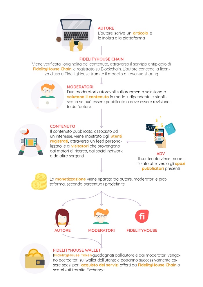 Il funzionamento è semplice: l’utente carica il suo contenuto (articoli, foto, video) e attende l’approvazione del moderatore, il quale sfrutta il servizio antiplagio della FidelityHouse Chain basato su blockchain.