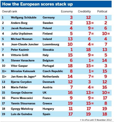 Da ormai sette anni, il Financial Times stila la classifica dei migliori ministri delle Finanze d’Europa: primo in classifica del 2012 è il tedesco Wolfgang Schäuble, ma anche l’Italia si difende, con Vittorio Grilli all’ottavo posto. Ultima, invece, la Spagna e il ministro Luis de Guindos.