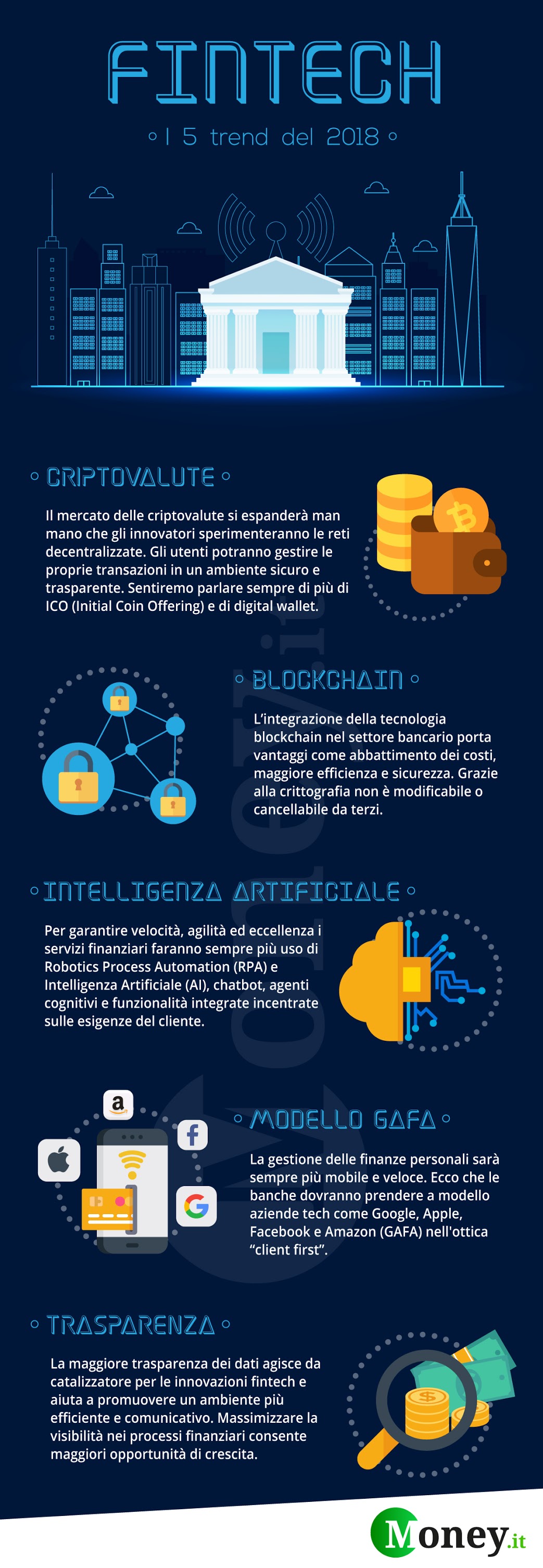 Ecco l’infografica di Money.it che ci mostra quali saranno 5 delle top tendenze Fintech che guideranno l’industria dal 2018 in avanti.