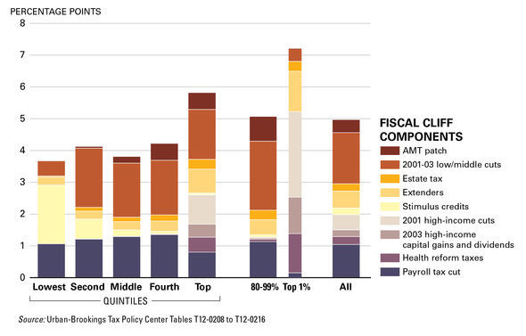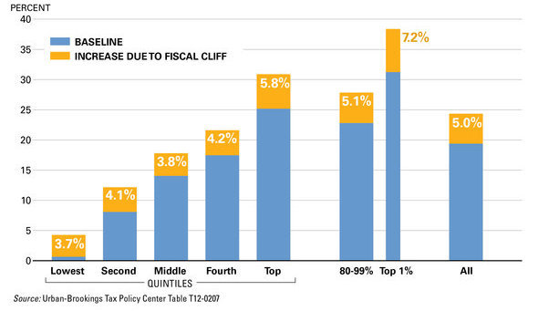 Il Tax Policy Center ha stimato che il fiscal cliff aumenterà le tasse per circa il 90% degli Americani, aumentando la media delle aliquote fiscali di circa 5 punti percentuali.