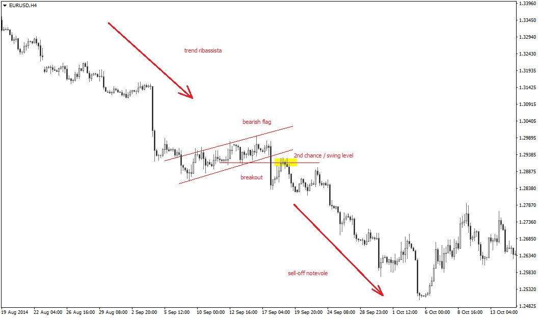 Il pullback assume la forma di una flag, che ben presto dà vita a un nuovo sontuoso breakout nella direzione della tendenza primaria. Qui il price action trader prende posizione una volta formatasi la breakout candle. In alternativa può valutare l’entrata con una strategia meno aggressiva, utilizzando un ordine “limit” sullo swing level (o altro livello chiave) più vicino. Il “re del forex”, a seguito del breakout della flag, scenderà fin sotto 1,25 a partire da area 1,29 nel giro di pochi giorni.