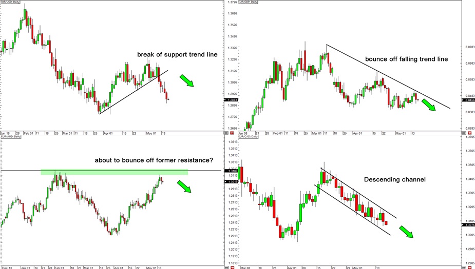Lo scenario, come si vede, inizia a mostrarsi tendente al ribasso per le coppie dell’euro, EUR/USD, EUR/GBP, EUR/AUD, EUR/CAD.