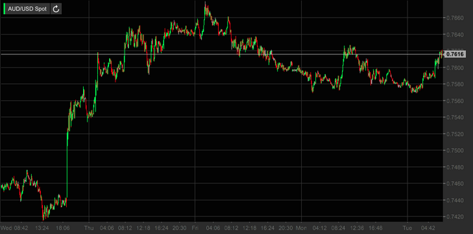 Il Dollaro australiano reagisce alle dichiarazioni del membro della RBA Glenn Stevens durante l’ASIC forum tenutosi a Sydney questa mattina e si porta al rialzo, scambiando al momento a 0,7616 nei confronti del dollaro USA, e facendo per il momento segnare una performance del +0,49%.