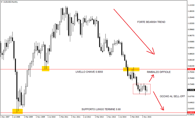 Da fine agosto scorso, quando imperversava la crisi dei mercati finanziari globali a seguito della svalutazione dello yuan da parte delle autorità monetarie cinesi, il tasso di cambio tra il dollaro australiano e il dollaro americano si è mosso in un range ben definito, tra area 0,74 e 0,68. La volatilità è stata tutto sommato contenuta e non sono avvenuti particolari rally direzionali. Su base mensile si è così formato un “ledge”, che in analisi tecnica identifica una fase di consolidamento del trend - a seguito di un robusto movimento direzionale – che si caratterizza per la presenza di due massimi e minimi della congestione corrispondenti tra loro (o quasi).