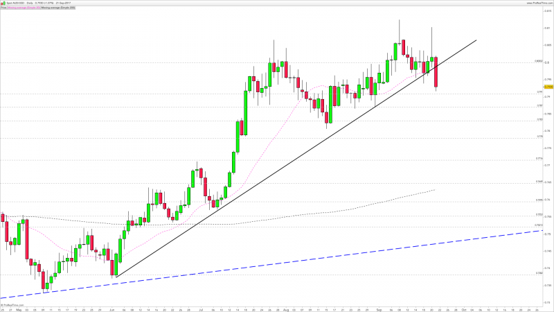 Analisi tecnica del cambio del dollaro australiano contro il dollaro statunitense (AUD/USD) su grafico giornaliero. Break ribassista della trendline.