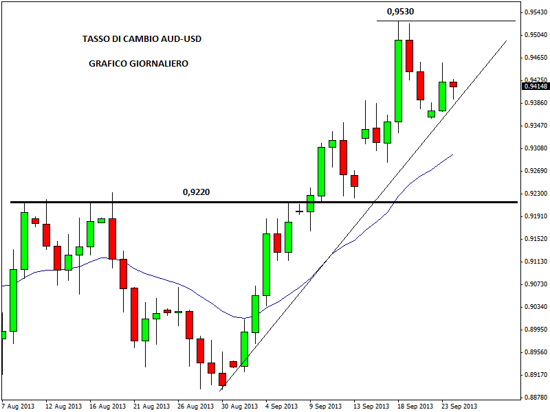 Dopo aver sofferto il continuo taglio dei tassi della RBA (da novembre 2011 a oggi i tassi sono passati dal 4,75% al 2,5%), il rallentamento della Cina e il crollo dei prezzi di alcune commodity, l’Australia è pronta a ripartire e a confermare il proprio status di paese con rating AAA apportando alcuni cambiamenti strutturali alla propria economia, negli ultimi anni diventata troppo dipendente dall’industria mineraria e dall’economia cinese. Sul forex il cambio Aud-Usd sta beneficiando del rinvio del tapering e del miglioramento dei dati macro cinesi, dopo che ieri il dato preliminare dell’indice Pmi manifatturiero Hsbc a settembre ha evidenziato una crescita superiore alle attese.