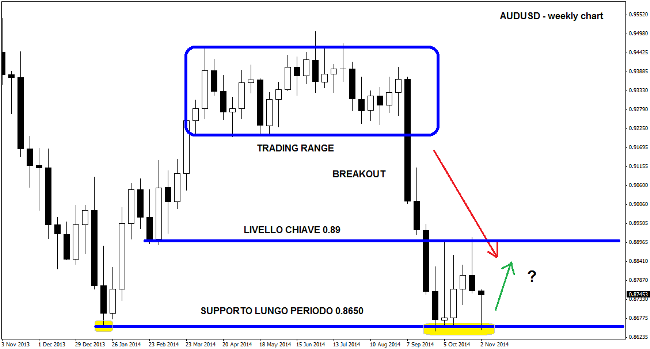 Il dollaro australiano ha reagito ancora una volta sul fondamentale supporto di lungo periodo posto a 0,8650 contro dollaro americano, evidenziando la presenza di una folta schiera di compratori su questi livelli chiave del prezzo. A favorire il rimbalzo dell’Aussie è stata la decisione della Reserve Bank of Australia di mantenere i tassi di interesse invariati al 2,5%, in linea con le aspettative degli analisti finanziari. Il costo del denaro nel paese oceanico è fermo sui valori correnti (i più bassi dal 1960, anno di fondazione della banca centrale) da inizio agosto 2013.