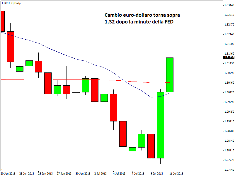 Il numero uno della FED ha allontanato l’ipotesi di aumento dei tassi di interesse e di riduzione del piano di acquisto dei titoli di stato da 85 miliardi di dollari al mese (il cosiddetto “quantitative easing”). In questo modo ha rilanciato le ambizioni di Wall Street, ridato serenità al mercato dei bond e messo al tappetto il dollaro americano. Sul forex il tasso di cambio euro-dollaro ha messo il turbo, salendo fino a 1,3206 sui massimi delle ultime tre settimane.