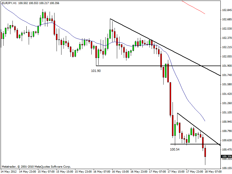Anche qui forte bearish trend. Osservando il chart a 60 minuti, si potrebbe ipotizzare un return move verso 100.50 – 100.70 per tentare uno short con target a 100 prima e 99.20 poi. Lo yen ha una forza spaventosa da ieri pomeriggio.