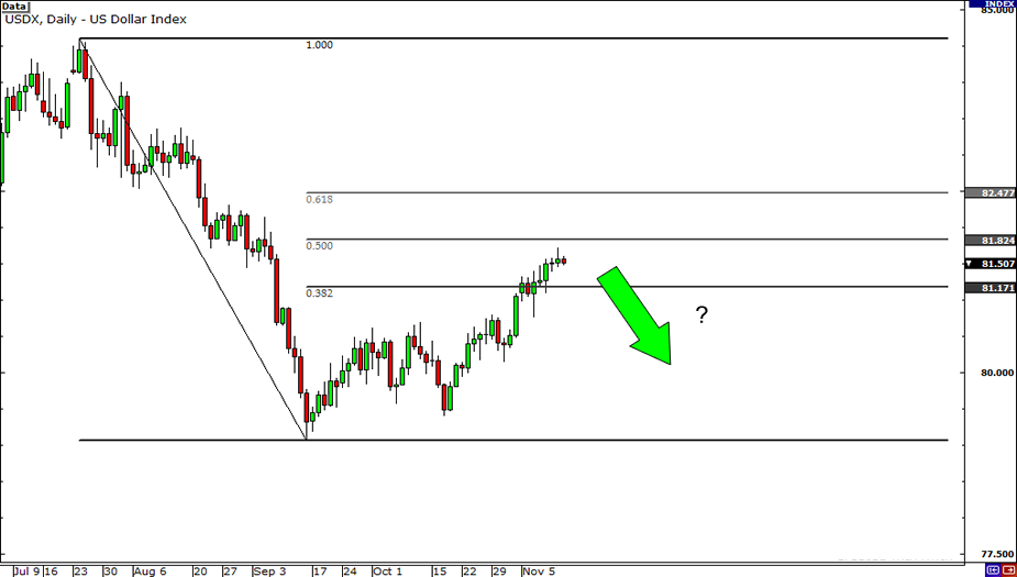 Il grafico dell’USDX (US Dollar Index) mostra come il prezzo abbia subito un pullback dal ribasso di settembre, ma i livelli di Fibonacci potrebbero divenire importanti e dure resistenze. Se l’incertezza riguardo al futuro economico degli Stati Uniti dovesse continuare, allora non mancherà di vedere un revival della linea di downtrend che ha caratterizzato l’USDX durante il terzo trimestre del 2012.