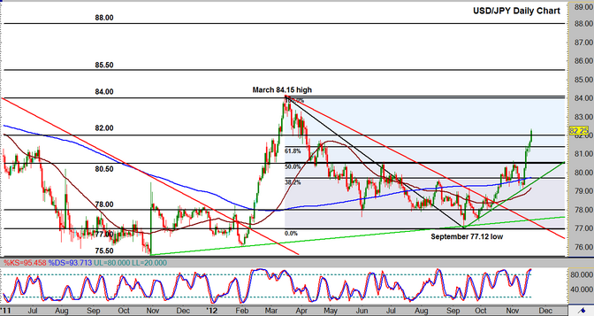 Il movimento rialzista può avere come target la linea 82 prima e 84 dopo, un’importante zona di test raggiunta lo scorso mese di marzo (grafico sopra). Negli ultimi due mesi i prezzi hanno formato una trendline rialzista che si estende frino al minimo di settembre al 77.0. Ilbreakout rialzista di questi ultimi periodi potrebbe accelerare, mentre in caso di ribasso, quella che è stata forte resistenza ad 80.50 potrebbe diventare un nuovo supporto alle correzioni ribassiste.