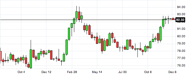 - 80.70 è stata resistenza durante il mese di giugno e, in maniera anche più forte durante il mese di ottobre, mentre a questo punto è una chiara zona di supporto. La linea 80 è psicologicamente molto importante, sebbene negli ultimi mesi sia stata "crossata" più e più volte.