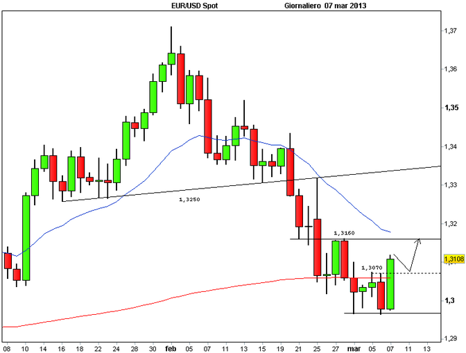 Sul forex il tasso di cambio euro/dollaro ha messo il turbo salendo fino in area 1,3120. Come indicato anche nel servizio Segnalidiforex.it, il cambio ora potrebbe spingersi fino a 1,3160. L’euro ha guadagnato terreno un pò contro tutti. Il tasso di cambio euro/yen è balzato di oltre il 2% fino in area 125. In grande spolvero anche il cambio euro/sterlina, che è tornato in area 0,8740. Acquisti poi su euro/franco svizzero, salito in area 1,2370. Più tardi, alle ore 12, la Bce comunicherà i dati sui rimborsi dei fondi della seconda operazione LTRO a 3 anni.