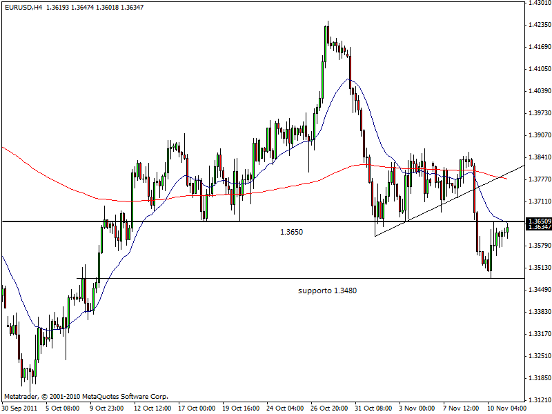 Sul Forex l’euro resta ampiamente sopra 1.36 contro dollaro e anzi sta cercando di scardinare l’area di resistenza posta a 1.3650. Ieri la chiusura positiva di Wall Street (Dow Jones +0,96%) ha fatto diminuire la percezione del rischio di brevissimo periodo e ciò ha facilitato il rimbalzo della valuta europea contro le majors. In caso di breakout di questi livelli, i prezzi potrebbero allungare addirittura fino a 1.37 prima e 1.3750 poi. Attenzione anche a EUR/JPY in fase laterale sul chart a 60 minuti: in caso di rottura al rialzo della resistenza di 105.70-80 è probabile un ulteriore allungo fino a 106 prima e 106.50 poi. In ripresa anche la sterlina: il cable è tornato in area 1.5930.