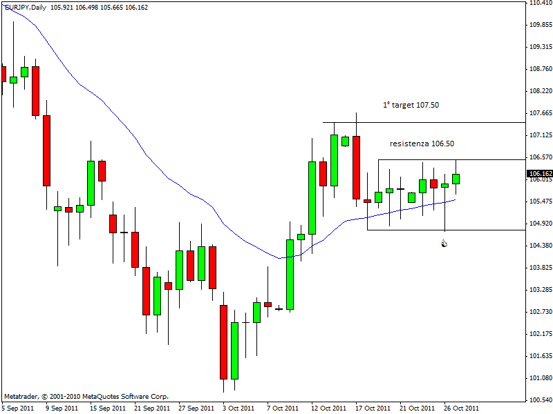 Sul Forex il cross EUR/USD ha cambiato marcia da ieri pomeriggio passando da poco sotto 1.38 a sopra 1.40 (top intraday 1.4014). Ora, se i prezzi riusciranno oggi a chiudere sopra la resistenza della EMA200 giornaliera, è probabile che il trend rialzista possa ulteriormente consolidarsi con obiettivi compresi tra 1.41 e 1.4150 nel giro di una settimana. Per ora non brilla, invece, EUR/JPY, ancora in fase di congestione sul daily chart. Tuttavia, dopo il poderoso recupero di ieri, è probabile che il breakout deciso di area 106.50 possa generare un forte movimento direzionale con primo target a 107.50.