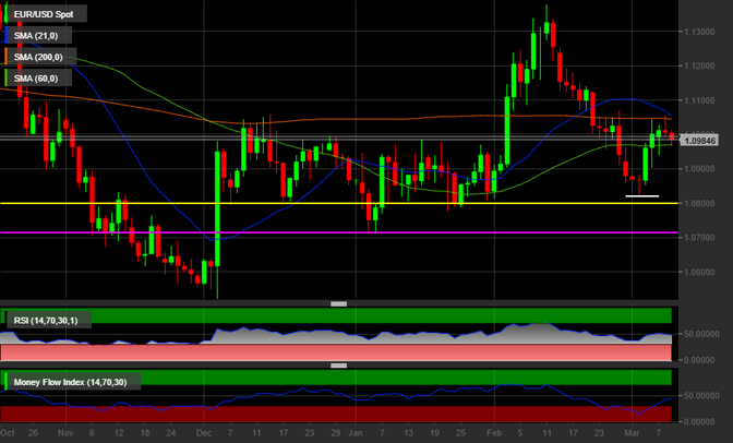 Nella sessione di ieri, il cambio aveva provato una risalita oltre quota 1,1$, salvo poi essere respinto a causa del ribasso del petrolio e in vista della fondamentale riunione del 10 marzo di domani della BCE. E’ probabile che oggi il cross, in assenza di market mover di rilievo, tenda a muoversi in funzione dell’andamento delle Borse e del petrolio, senza però dimenticare l’appuntamento di domani con la Banca Centrale Europea.