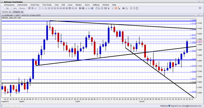 – 1.2880 di nuovo supporto, come nel mese di ottobre, è stato il punto che ha segnato la battuta di arresto del rally dell’Euro dopo la vittoria di Obama. Seguita dalla linea 1.28 che è il punto più basso del range attuale, ma ancora comunque lontano.