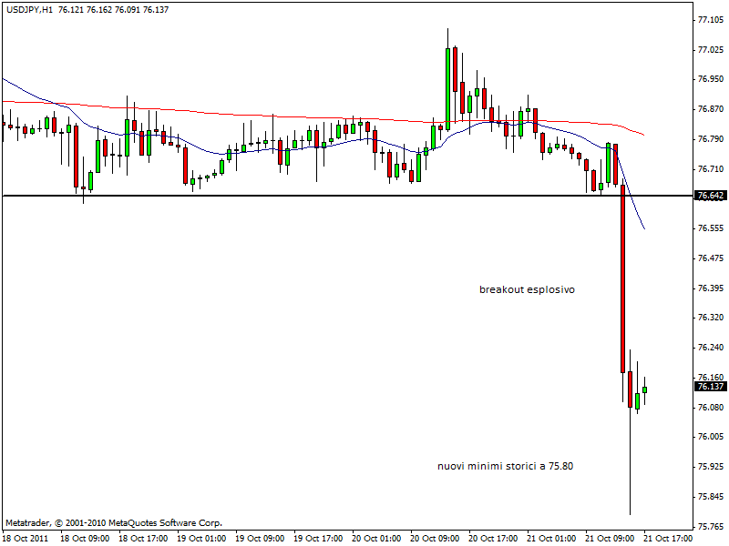 Wall Street prosegue la seduta in forte rialzo (Dow Jones +1,7%) sulla scìa di quanto mostrato già per gran parte della giornata dalle borse europee, tra le quali spicca il balzo della borsa di Francoforte (+3%) a pochi minuti dalla chiusura delle contrattazioni. Gli investitori sono in attesa di soluzioni positive per la crisi in Europa, anche se la Merkel e Sarkozy hanno già fatto intendere che un piano europeo anti-crisi sarà comunicato solo nella giornata di mercoledì prossimo. Nel frattempo sul Forex l’euro ha messo la quarta marcia soprattutto contro il dollaro americano, la valuta più venduta in questa seduta. Il cross EUR/USD si è spinto fino a 1.39, come da previsioni, e sta provando anche a scardinare le resistenze intraday per un ulteriore allungo verso 1.3915 prima e 1.3940 poi. Il dollaro americano ha invece toccato nuovi minimi storici contro lo yen (vedi grafico in basso): dalle ore 14.30 alle 15, il cambio USD/JPY è sceso fino a toccare 75.80 (circa 80 pip di discesa). Gli acquisti improvvisi sullo yen facendo scendere anche EUR/JPY fino a 105.03, mentre euro/dollaro continua a salire con grande forza. Ora il cambio euro/yen è in area 105.70, ma resta la coppia di valute più volatile delle ultime ore (anche se sembra proiettata verso quota 106). Sul Forex non è affatto rallentata la corsa al rialzo della sterlina. Infatti, il cambio GBP/USD è sui massimi di giornata in area 1.5950 pronta per un nuovo allungo fino alla soglia psicologica di 1.60. Tra le commodity sembra tonico l’oro, anche se i prezzi sono stati respinti in modo brusco poco prima dell’approdo in area 1650$ l’oncia. Forti acquisti anche sul petrolio Wti, che ha sfiorato nuovamente quota 89$ al barile.