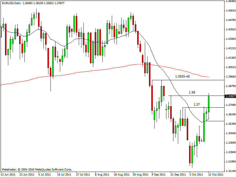 Borse europee in netto rialzo anche oggi, nonostante la crisi del debito sovrano continui a preoccupare tantissimo le autorità politiche e monetarie del vecchio continente. Sul Forex l’euro sta proseguendo nella sua spettacolare risalita dai bottom di periodo e ha superato anche quota 1.38 contro dollaro americano, un target che avevamo più volte indicato nei report precedenti. I prezzi hanno raggiunto un massimo di giornata a 1.3816 e nelle prossime ore, magari dopo una fase di consolidamento, potrebbero iniziare a salire con grande forza anche verso il target successivo posto in area 1.3940 dove tra l’altro passa anche la resistenza dinamica della Ema200 giornaliera. La moneta unica europea sembra davvero uno schiaccia-sassi, ma non solo contro il biglietto verde. Infatti, sul Forex è in grande spolvero anche euro/yen che ha toccato un top intraday a 105.80, molto vicino al primo target ipotizzato più volte nei report precedenti a 106. Ad ogni modo, sia su eur/usd che su eur/jpy, i breakout dei livelli critici di 1.37 e 105 hanno generato un fortissimo movimento direzionale che dura ormai da tre ore senza particolari soste lungo il trend. Sul Forex molto bene anche la sterlina, che beneficia del buon appetito per il rischio spingendosi fino a 1.5784 contro dollaro. Tra le materie prime acquisti anche sull’oro, che ha sfiorato quota 1690$ l’oncia, e sul petrolio Wti che però al momento non riesce a mettersi alle spalle la resistenza di area 86.5$ al barile.