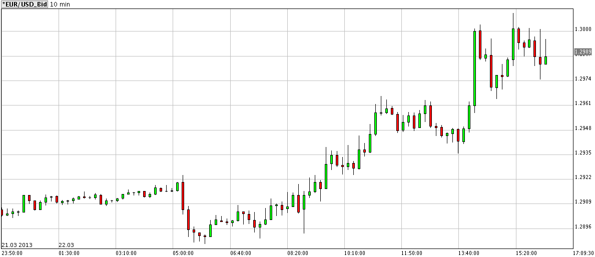 Il cambio Euro/Dollaro è avanzato dal supporto a 1.2880 verso la resistenza a 1.2960 per poi romperla definitivamente dopo le notizie positive da Cipro. Al momento EUR/USD è scambiato a 1.2992 dopo aver oltrepassato momentaneamente la resistenza a 1.30.