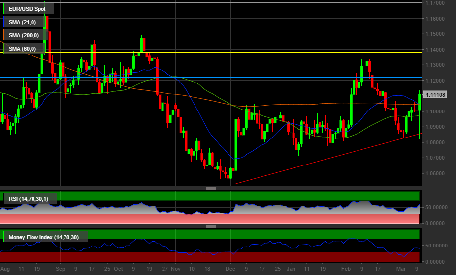 Il quadro grafico in effetti evidenzia una certa indecisione degli operatori. Il movimento di oggi infatti suggerisce che l’Euro-Dollaro non sappia ancora bene che direzione prendere vista la candela grafica odierna. Dopo un allungo sul minimo del 2 marzo, il cambio ha virato rotta per portarsi sui valori attuali sopra 1,1$.