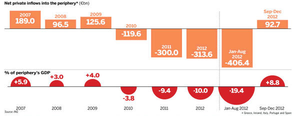 Secondo i dati ING, la rete di flussi capitali diretti ai paesi periferici ha raggiunto i 93 miliardi negli ultimi 4 mesi del 2012. Al contrario, nei primi otto mesi del 2012, circa 406 miliardi di euro sono usciti da Spagna, Italia, Portogallo, Irlanda e Grecia per un equivalente circa del 20% del prodotto interno lordo di queste economie. Nel 2011, i flussi diretti fuori dalle economie periferiche ammontavano a 300 miliardi di euro.