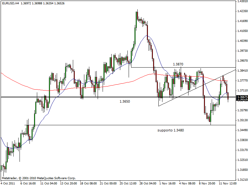 Sul Forex l’euro è venduto a piene mani dagli investitori, così come la sterlina, mentre hanno corso molto in mattinata sia lo yen che il dollaro americano. Il cross EUR/USD è sceso fino a 1.3635 e ora sta cercando di provare un rimbalzo dalla cluster area di 1.3650. Un ritorno della positività dovrebbe avvenire soltanto in caso di breakout deciso di 1.37, altrimenti nelle prossime ore i prezzi potrebbero approfondire ulteriormente il ribasso almeno fino a 1.36 – 1.3580.