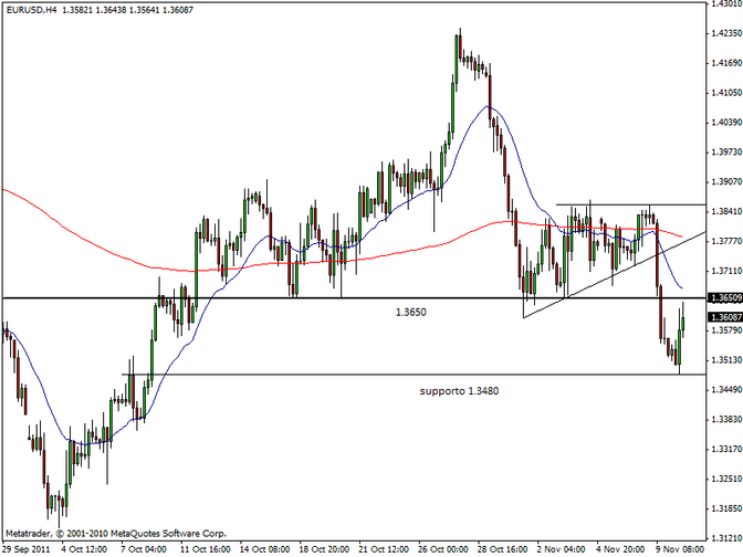Sul Forex anche l’euro è rimbalzato con grande forza dopo aver trovato un supporto di breve in area 1.3480 contro dollaro americano.Il cambio EUR/USD ha raggiunto 1.3644, mentre EUR/JPY si è spinto fino a 105.87 dai bottom intraday di 104.72. Sul Forex la volatilità è scesa molto rispetto a stamattina, ma la sensazione è che nelle prossime ore possa avvenire un nuovo incremento dell’attività degli operatori dopo la pubblicazione di alcuni market mover americani (bilancia commerciale e sussidi per la disoccupazione) e a seguito dell’apertura di Wall Street. Il cambio euro/dollaro potrebbe aver già toccato un top di brevissimo periodo e in ogni caso ha già raggiunto una importante zona di resistenza.