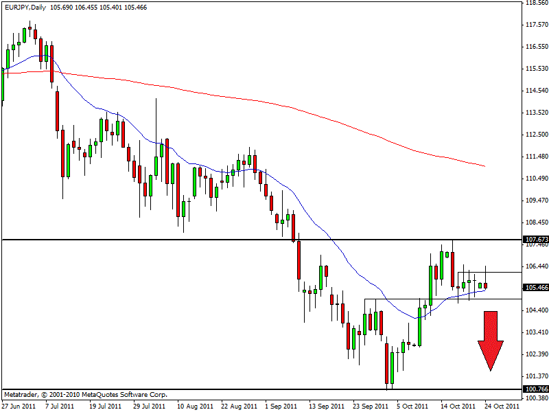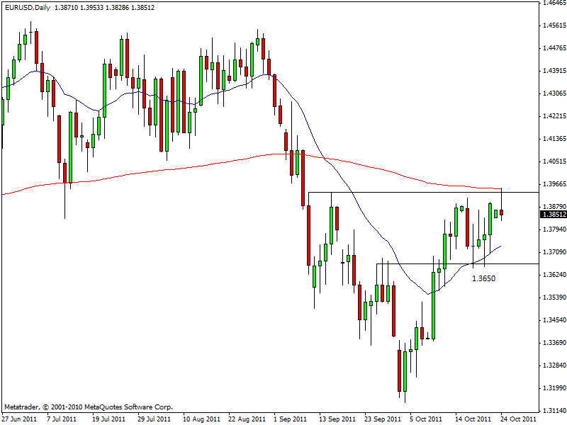 Inutile dire che la settimana inizia con molti interrogativi dopo la risata ironica di Sarkozy e della Merkel alla domanda di un giornalista che chiedeva se i due leader avessero fiducia nell’Italia. In realtà, si capisce che ormai l’attenzione è rivolta quasi esclusivamente sull’Italia, alla quale è stato girato un ultimatum dall’Europa affinchè acceleri nelle riforme. Intanto, il vertice UE del week-end ha portato all’accordo sulla ricapitalizzazione delle banche europee. L’intesa prevede nuovi stringenti stree test e nuovi capitali per circa 108 miliardi di euro. Il tutto entro 6-9 mesi. Sul Forex l’euro ha avuto una buona partenza spingendosi fino a 1.3953 (nuovo massimo da oltre un mese), cioè poco sopra la resistenza di area 1.3940 dove però è iniziata una decisa fase di distribuzione che ha riportato i prezzi in area 1.3850. La decisa opposizione dei venditori sui livelli di resistenza della Ema200 daily sta portando alla formazione una shooting star, cioè una candela di esaurimento del trend. Sebbene manchino ancora molte ore alla fine della seduta, al momento ci sono molti indizi che fanno pensare a una possibile inversione del trend. L’obiettivo di breve periodo potrebbe essere 1.3750, anche se il supporto chiave resta assolutamente 1.3650.
