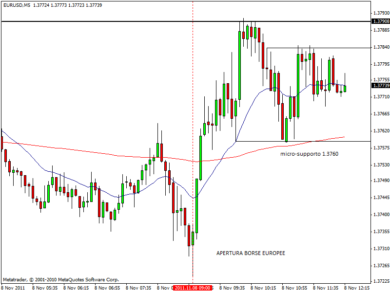 Sul Forex il cross EUR/USD si è spinto stamattina fino in area 1.3790 grazie anche alla buona apertura delle borse europee, attualmente ancora in territorio nettamente positivo. I prezzi hanno trovato un buon supporto di brevissimo periodo a 1.3760, la cui tenuta potrebbe permettere al cambio di tentare un nuovo test dei top intraday per un possibile allungo almeno fino in area 1.3820-30. Osservando il grafico intraday a 5 minuti è possibile visualizzare la fase laterale attualmente in corso. Per quanto riguarda EUR/JPY, invece, i prezzi sono stati respinti al superamento di area 107.50 dopo aver trovato stamattina un buon supporto in area 107.10.