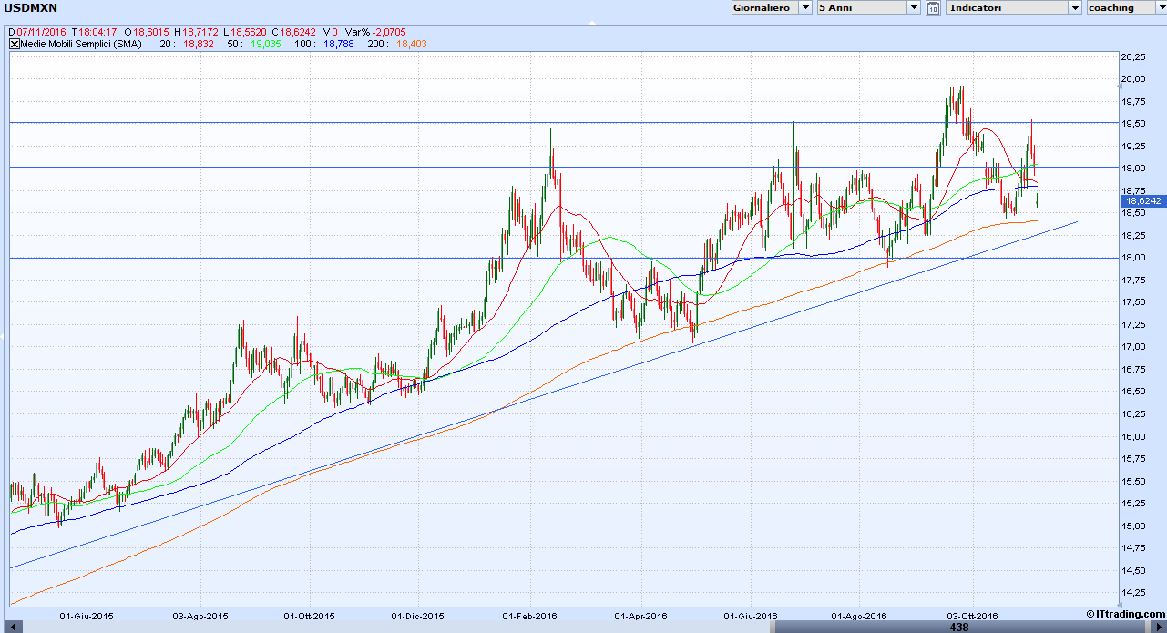 Tali vicende hanno fatto acquistare al cambio Dollaro Peso messicano una volatilità che non aveva mai mostrato in precedenza. Un susseguirsi di massimi e minimi che hanno tentato di mettere in discussione un trend rialzista che dura da quasi tre anni. Peso che ha risentito molto dei consensi accordati al candidato repubblicano durante tutta la campagna elettorale. Trump ha spesso dichiarato di voler limitare le importazioni e voler costruire un muro al confine con il Messico. Tali affermazioni pesano molto sul Peso perché se le esportazioni messicane dovessero diminuire, oltre all’economia, anche la valuta ne risentirebbe fortemente.