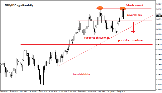 Sul forex il tasso di cambio NZD/USD ha bruscamente frenato la sua corsa al rialzo, scivolando a 0,8655 dopo che i prezzi erano saliti fino in area 0,8780 ai massimi da agosto 2011. Gli investitori hanno iniziato a vendere dollari neozelandesi, soprattutto sui mercati asiatici, approfittando anche del peggioramento del sentiment sul Kiwi dopo il deludente dato sul mercato del lavoro nell’arcipelago oceanico. Infatti nel primo trimestre il tasso di disoccupazione in Nuova Zelanda si è attestato al 6%, in linea con il precedente trimestre ma sotto le attese degli analisti che invece si aspettavano un miglioramento al 5,8% (il livello più basso dal primo trimestre 2009).