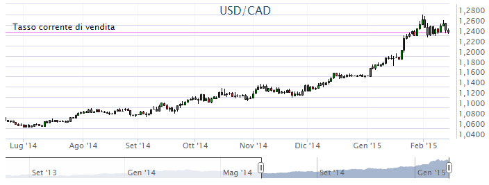 Grafico a 1 giorno. Tasso di cambio su USD/CAD da luglio 2014 ad oggi: aumenta con il diminuire dei prezzi del petrolio