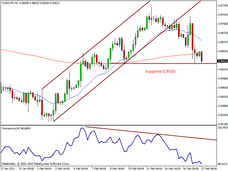 Il cambio USD/CHF sembra in grosse difficoltà dopo essere stato respinto da area 0,9770-80, che tra l’altro sul weekly chart era un’importante resistenza dinamica (Ema20). L’ascesa dei prezzi iniziata lo scorso primo febbraio da area 0,9330 e bene evidenziata dalla presenza di un canale rialzista ben definita sembra aver esaurito la sua capacità di formare nuovi massimi, in virtù anche di una netta divergenza tra prezzi e momentum. La rottura ribassista del canale sul grafico a 4h ha creato i presupposti per un ritorno della negatività, considerando anche un tentativo di return move fallito in area 0,9740. Ora siamo giunti sul supportone di 0,95, un bivio per la direzione dei prezzi. In caso di breakdown deciso, dovrebbe tornare la forza dirompente del franco svizzero con obiettivo minimo in area 0,93, cioè i precedenti minimi storici del cambio.