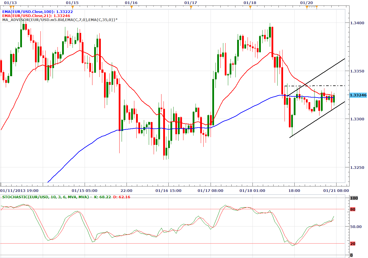 L’euro dopo il test di 1.3400 che ha fornito ottime opportunità di vendita dal punto di vista del risk reward, è riuscito a raggiungere 1.3300 per poi partire in una correzione abbastanza debole, che non è stata in grado di riportare i prezzi sopra 1.3340 che rappresenta la resistenza di breve periodo. Potremmo assistere a due scenari contrastanti, sulle prime ore del mattino. La rottura a rialzo della resistenza statica indicata, con target per la formazione di una potenziale bandiera ribassista, che se dovesse lasciare spazio a 1.3375 potrebbe riprovare la rottura dei massimi a 1.3400, ovvero un proseguimento a ribasso senza passare dalle resistenze che si potrebbe avere con il superamento di 1.3300, ma che per divenire definitivo deve passare a ribasso 1.3275.