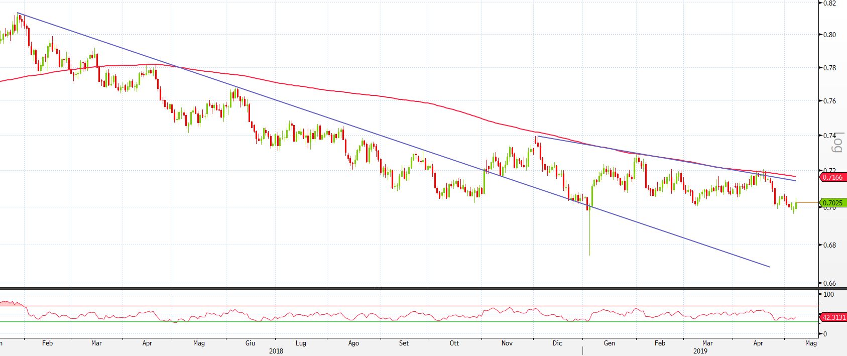 Il trend di medio e lungo periodo è infatti ancora orientato al ribasso e eventuali guizzi rialzisti come quello di questa notte possono esser interpretati come occasioni per riposizionarsi al ribasso sul cambio. Operazioni short sul cambio Aud/Usd avrebbero come target naturale 0,70 dollari, mentre quota 0,68 dollari rimane l’unico target tecnico ribassista mancando ulteriori riferimenti grafici degni di nota.