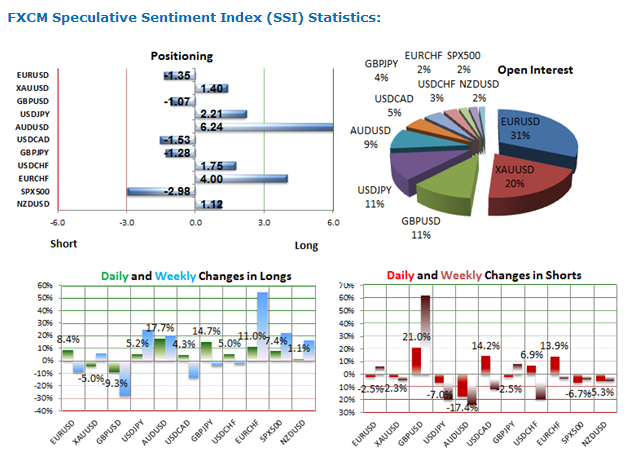 Un buon quadro tecnico senza dubbio, ma il fattore che volevamo portare alla vostra attenzione risulta essere le indicazioni che abbiamo potuto trarre analizzando il posizionamento (a prescindere dal peso di ogni posizione) dei trader retail che lavorano con FXCM, che essendo uno dei più grossi broker al mondo, può essere considerato come veicolo per l’estrapolazione di popolazioni (statisticamente parlando) che possono essere considerate un campione rappresentativo dell’intero mercato retail. Tutto questo viene estrapolato dallo Speculative Sentiment Index, un indicatore che mette a rapporto il numero di trader lunghi contro il numero di trader corti su uno strumento finanziario, andando a dipingere le aspettative che essi hanno su questo o quello strumento.