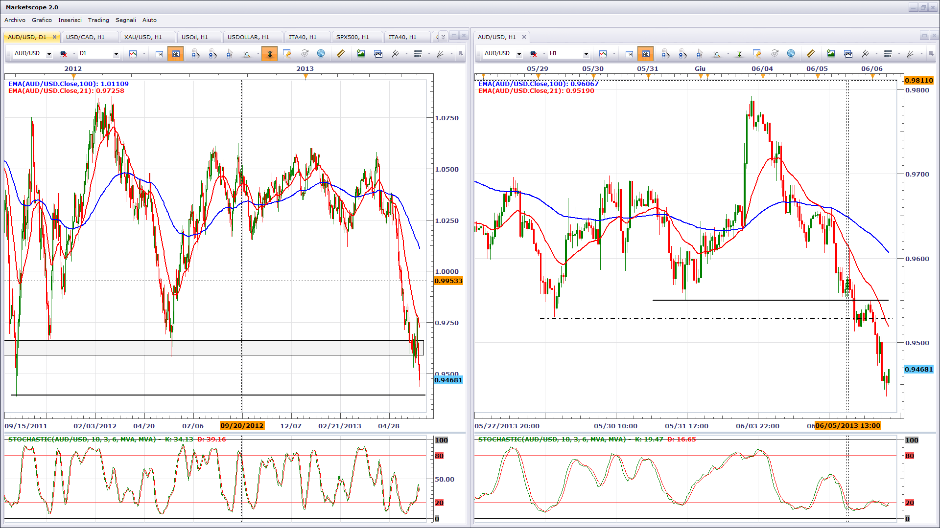Riprendiamo brevemente il pezzo scritto ieri mattina sul dollaro australiano, prima di ragionare su quanto è successo: “Discesa sotto 0.9665 ed estensioni fino a figura, prima di tentare dei rimbalzi che non sono stati in grado di superare le medie orarie, creando una buona area di resistenza statica/dinamica intorno a 0.9650. Dopo la pubblicazione del Pil di questa notte, inferiore alle aspettative su base annuale (2.5% vs consensus 2.7% e precedente 3.2%) e la mancata reazione del cambio a causa dell’effetto Abe, è possibile che con l’avvento della liquidità londinese si possano provare degli approfondimenti ribassisti, da valutare sotto 0.9585, con potenziali target sui minimi. Attenzione in caso di avvicinamento ai minimi allo Speculative Sentiment Index, in caso di incrementi si sbilanci long è possibile che il mercato possa accelerare a ribasso a causa di ordini in stop sotto i minimi che potrebbero essere presi. Acquisti soltanto in caso di divergenze dall’orario in su o di superamento delle resistenze".