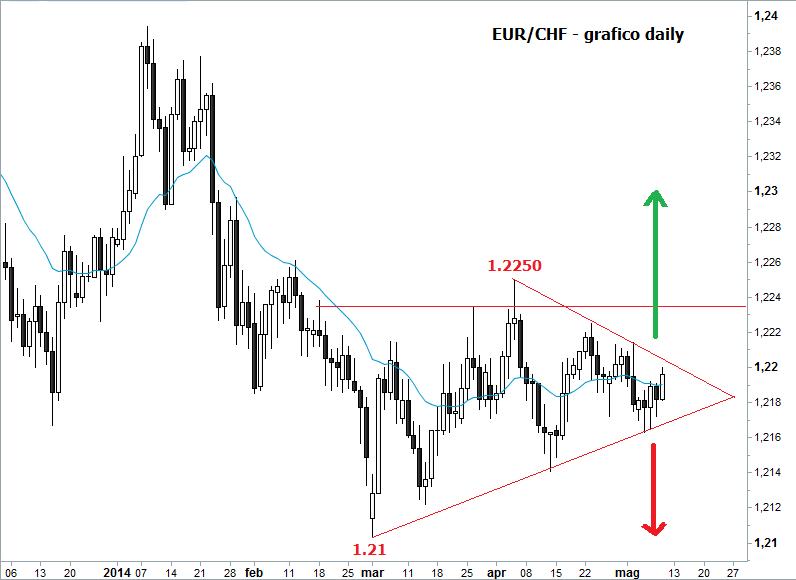 Ora che all’orizzonte si profilano pericolosi risvolti alle elezioni europee del 25 maggio, con i movimenti anti-euro sempre più in ascesa nei sondaggi con picchi del 25-30%, il franco svizzero potrebbe continuare ad essere oggetto di acquisti da parte degli investitori internazionali. Tuttavia le grandi banche d’affari continuano a confermare la loro view negativa sulla moneta elvetica, considerando la sua attuale sopravvalutazione e la volontà della SNB di portare avanti la politica del cambio debole dopo aver fatto incetta di euro in questi anni. Attualmente il cross EUR/CHF si muove in area 1,22, ma il 3 marzo scorso era sceso a 1,2104 ai minimi da oltre un anno in scia alle tensioni geopolitiche in Ucraina, confermando così lo status di valuta rifugio del franco.